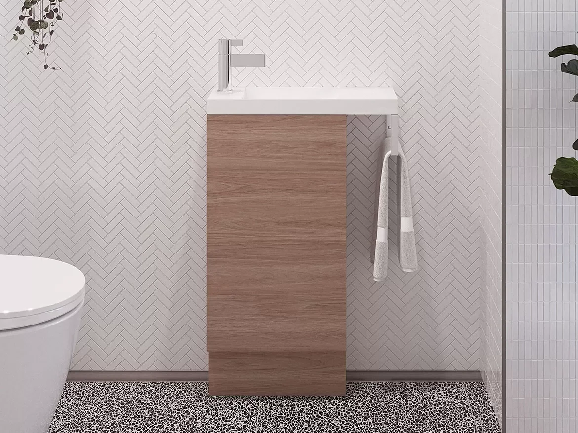 Simple and practical! The Oscar vanity is a perfect fit if you’re looking for a compact vanity design with functional features. The top extends to a chrome towel rail, keeping your hand towel conveniently close to the basin.